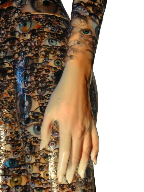Réaliser des estampes numériques à partir de nos sculptures est certes une initiative particulière qui s’insère à l’intérieur du nouveau paradigme de l’art contemporain. Ce que nous proposons, c’est photographier nos sculptures, non seulement pour des fins d’archivage et de documentation, mais aussi afin de s’en servir comme matière première, voire comme une matrice de base pour nos créations bidimensionnelles. Nous ajoutons et/ou soustrayons des éléments réels et virtuels afin de proposer des images qui réfèrent certes à leur source mais qui s’en distancient tout autant. Nous hybridons ces personnages de manière anthropomorphique dans un contexte environnemental propice à leur plénitude et, ce faisant, nous leur octroyons une nouvelle vie, une deuxième naissance, originale et inédite. Esthétiquement parlant, nous favorisons l’intégration d’éléments exogènes tels que des feuilles d’or, des plumes, du collage et autres, qui singularisent chaque estampe. Les images créées grâce à cette technique soulèvent elles aussi de multiples interrogations. Elles évoquent à la fois un passé mythologique et un présent contemporain teinté d’un surréalisme inquiétant.